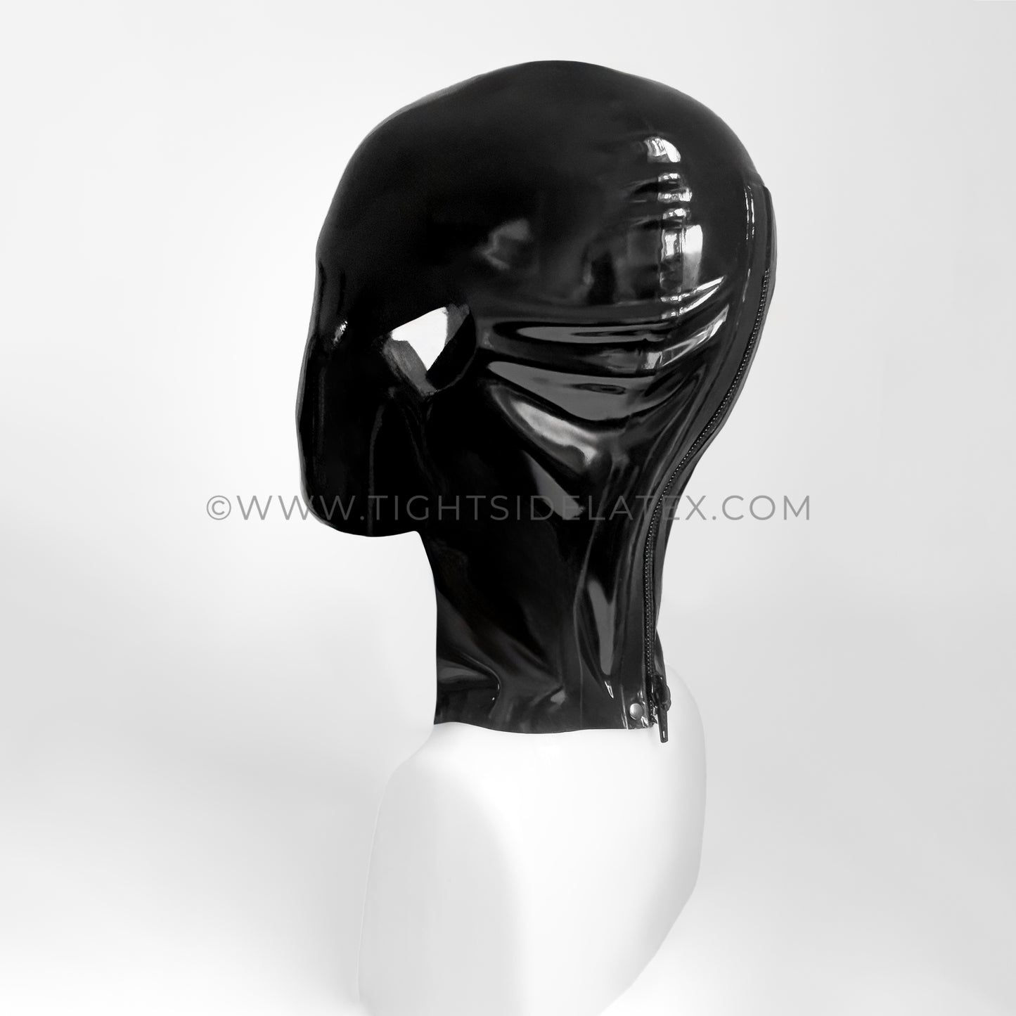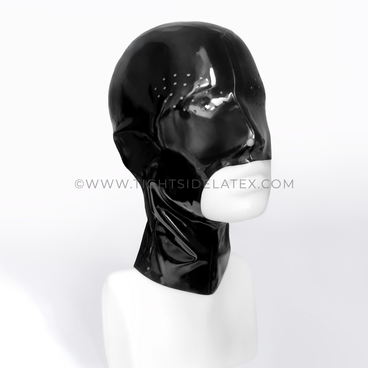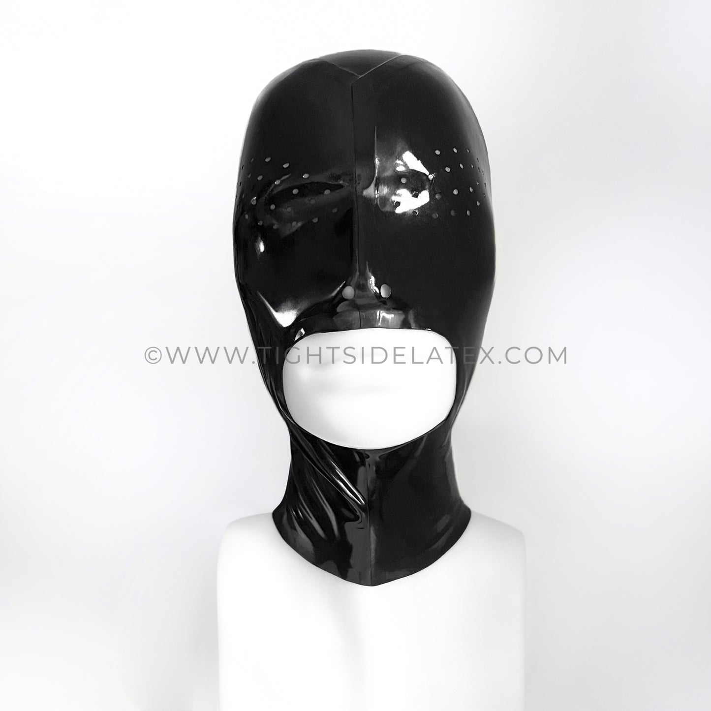 The perfect handmade latex hood for him and her. Cover your eyes and open your mouth with this new take on our bestselling perforated hood.